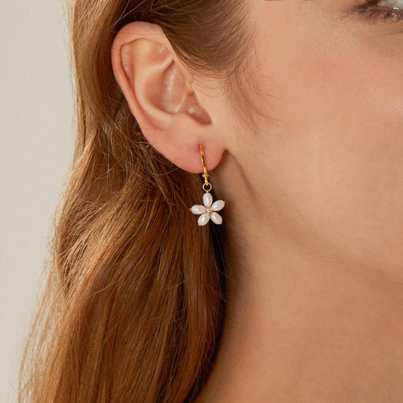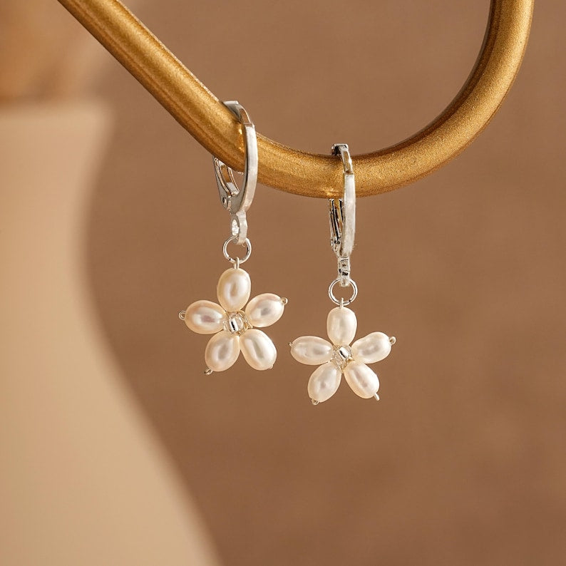 Freshwater Pearl Earrings,Dainty Flower Hoop Earrings,Daisy Pearl Earrings,Pearl Bracelet,Bridal Earrings,Wedding Earrings,Pearl Jewelry Set